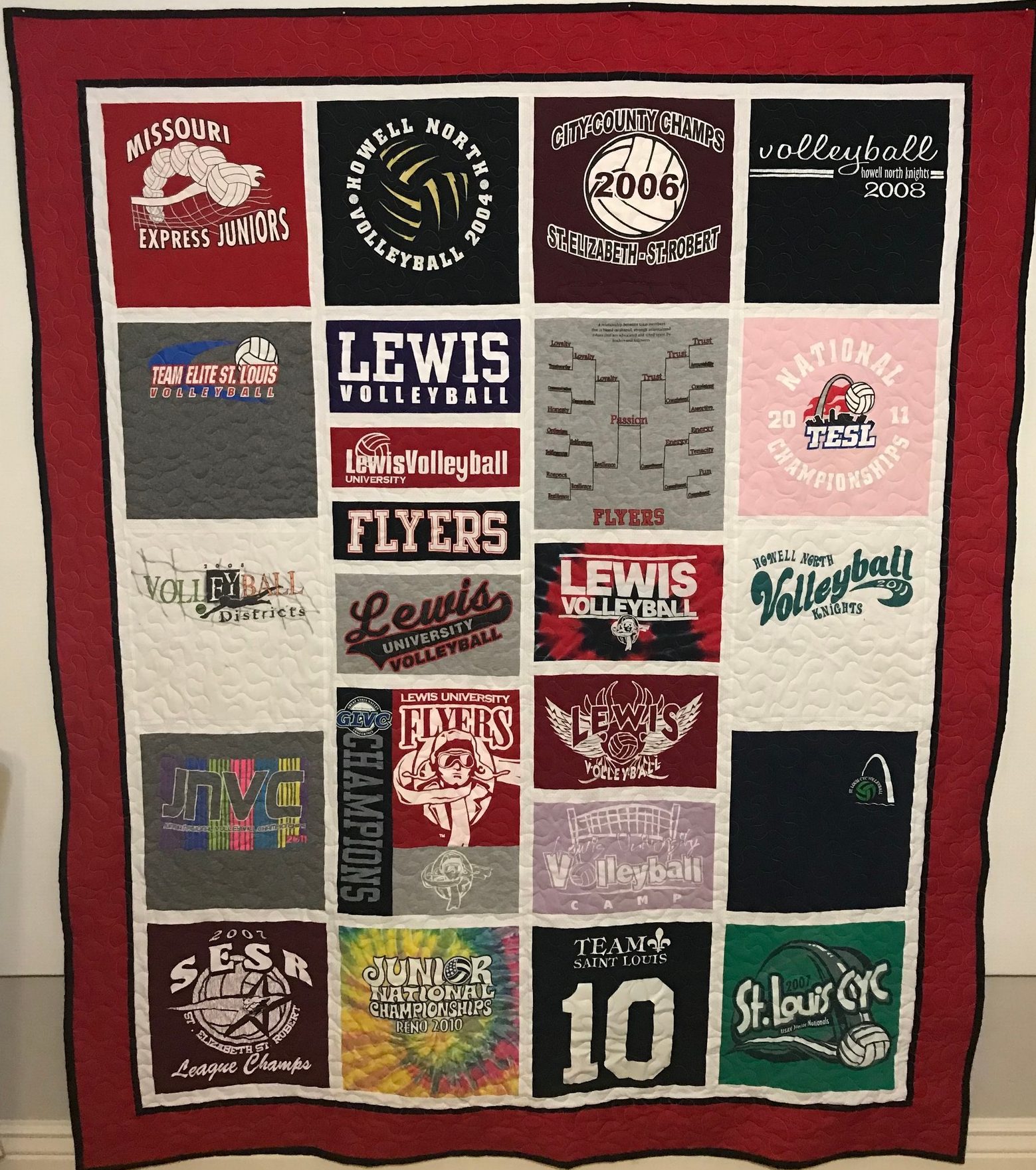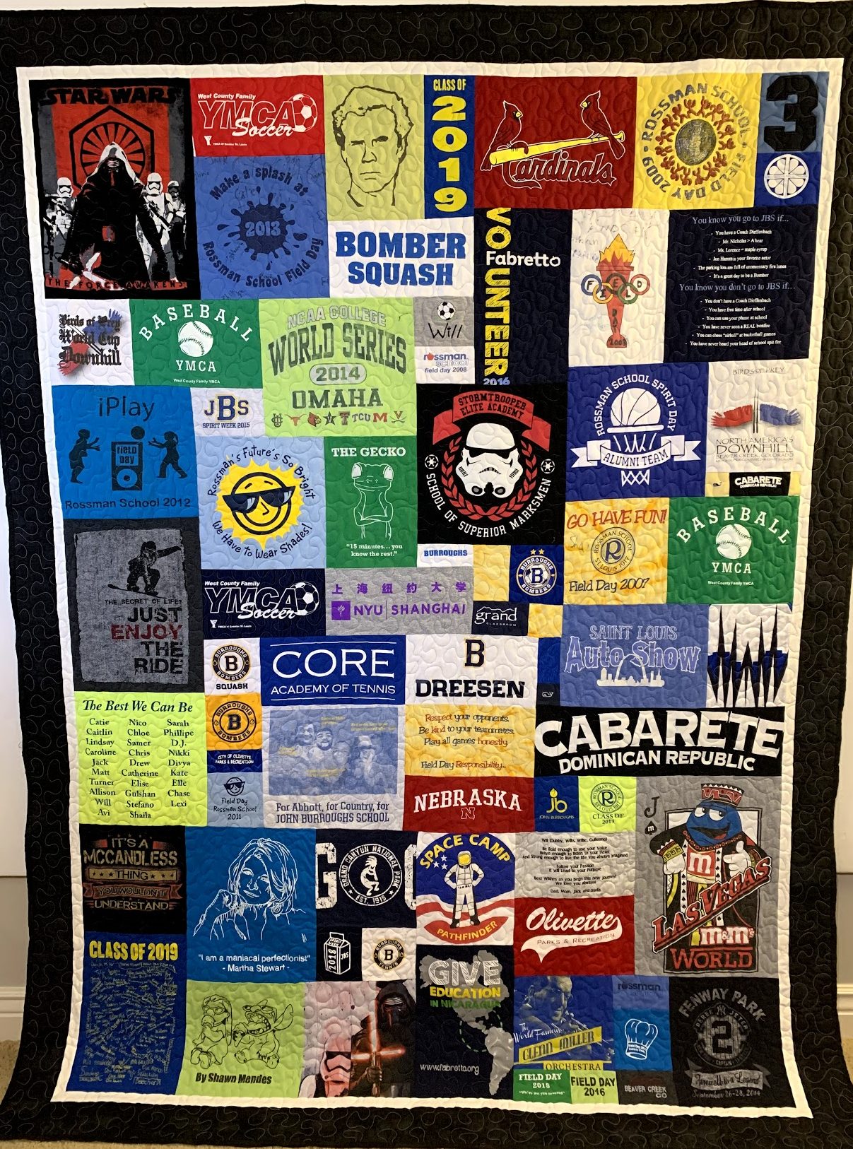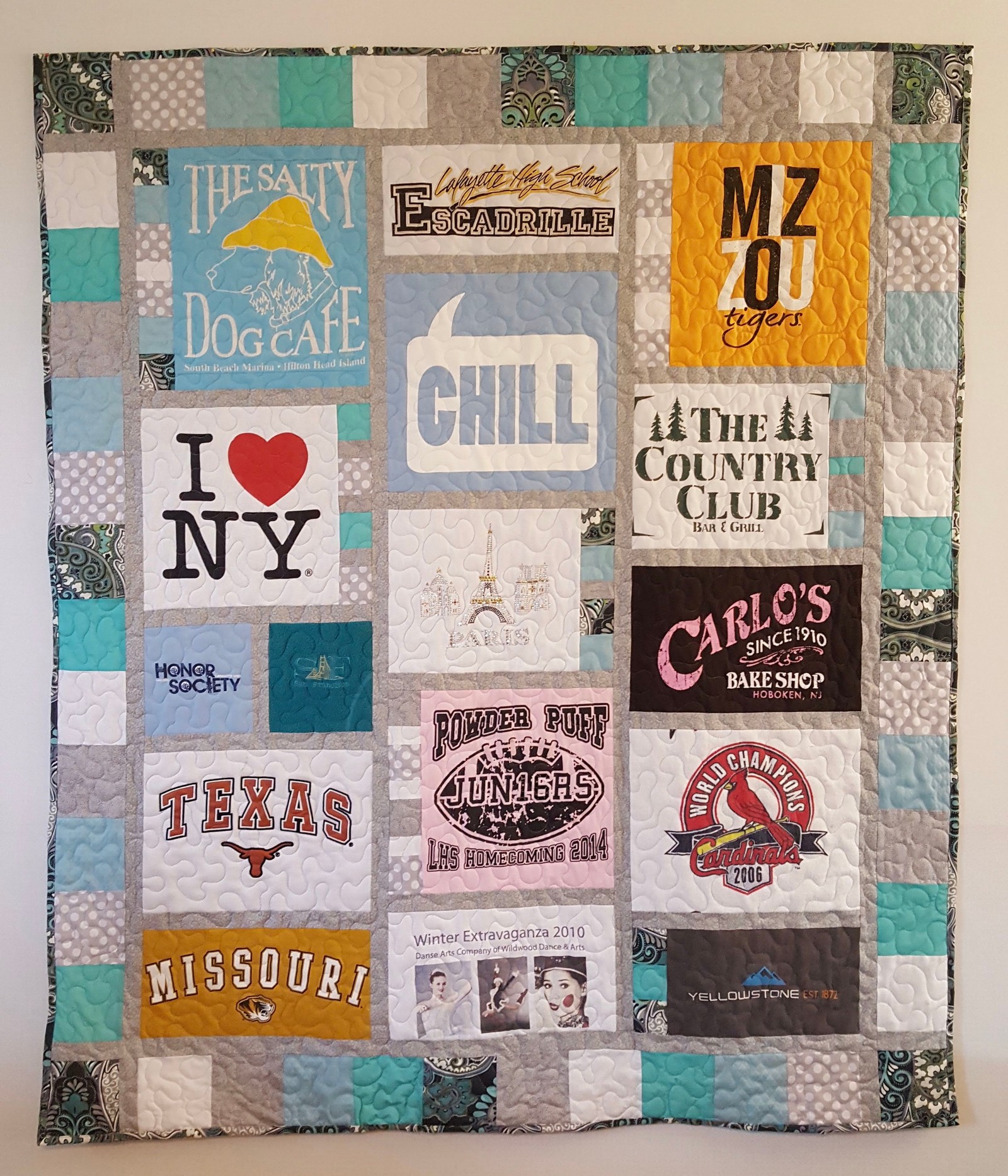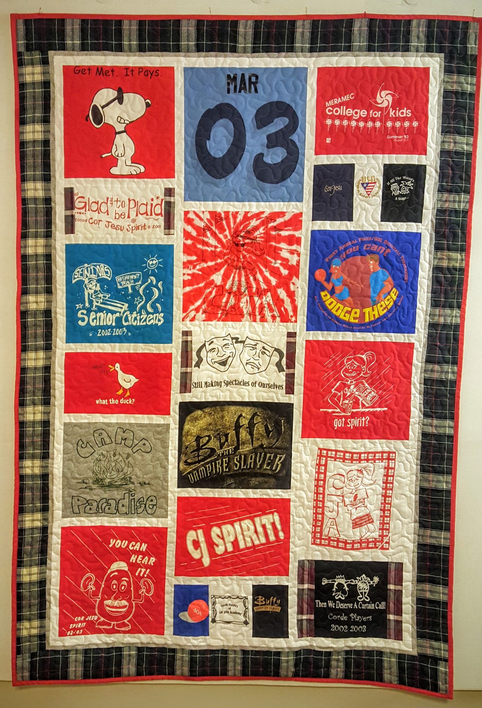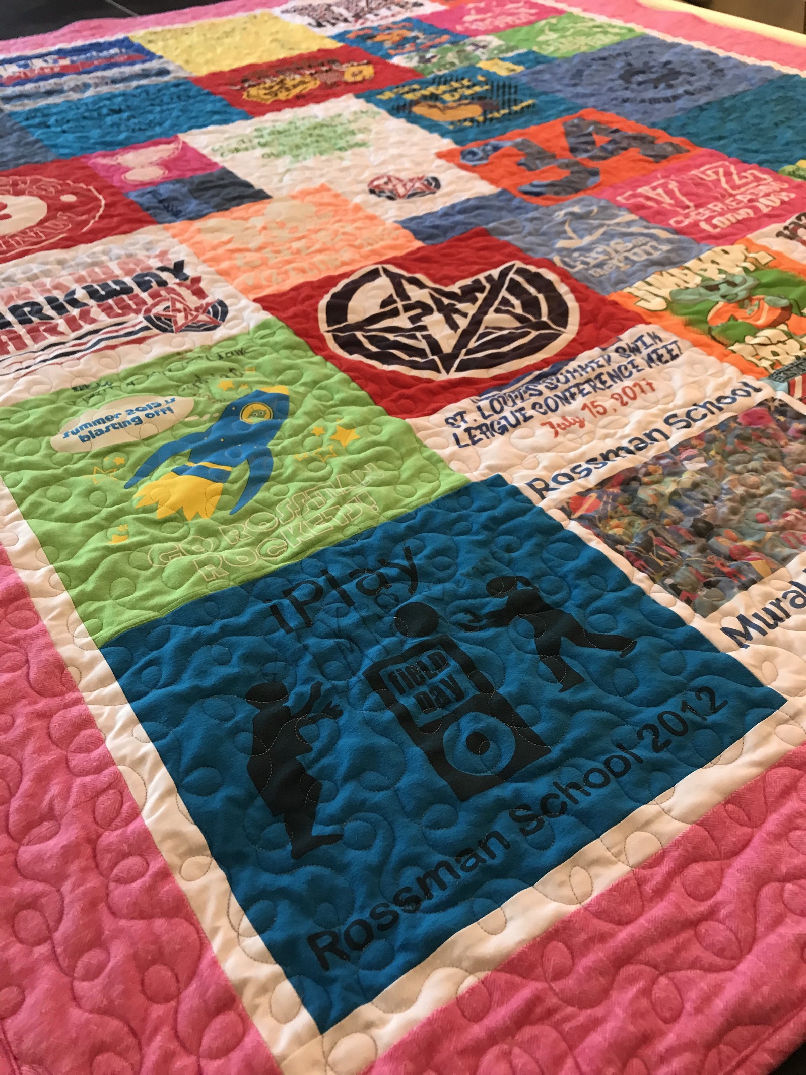 Quilt Gallery Quilt made from child’s clothing and artwork This has over 600 squares from children’s clothing! King Size Turtle design custome embroidery Infant baby clothes Back of pillow Uneven Rows Leaves for this family tree quilt are from the families clothes. Pillow made out of a t-shirt Back of Pillow Memory Quilt made from ties Made with hockey patches Wedding Dress